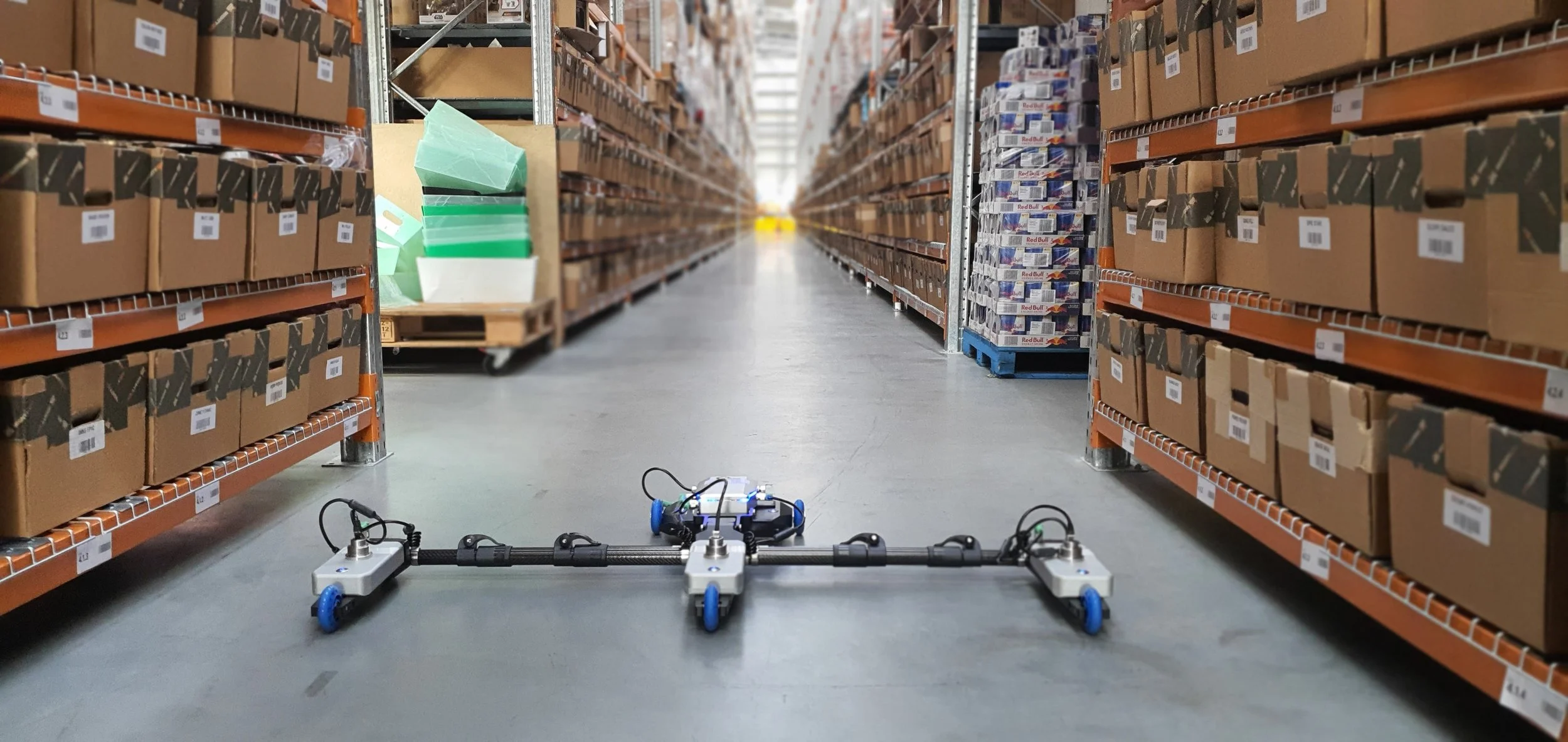 Automated robot on the floor of a warehouse aisle, surrounded by shelves stocked with boxes.